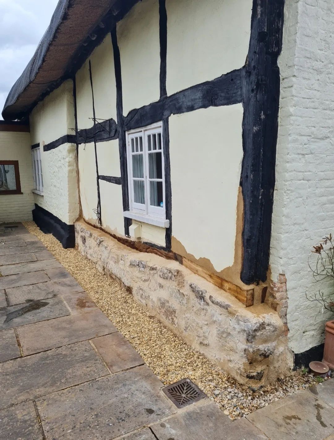 A line was cut across the modern sandstone paving to widen the French drain - which was carefully dug out (with the approval of the County Archaeologist) and lined with a permeable ground membrane before new gravel was added; the exposed old oak (and the new) was protected and toned-in with casein paint; lime pointing and a lime mortar haunch throw off rainwater; all the materials can better 'breathe'