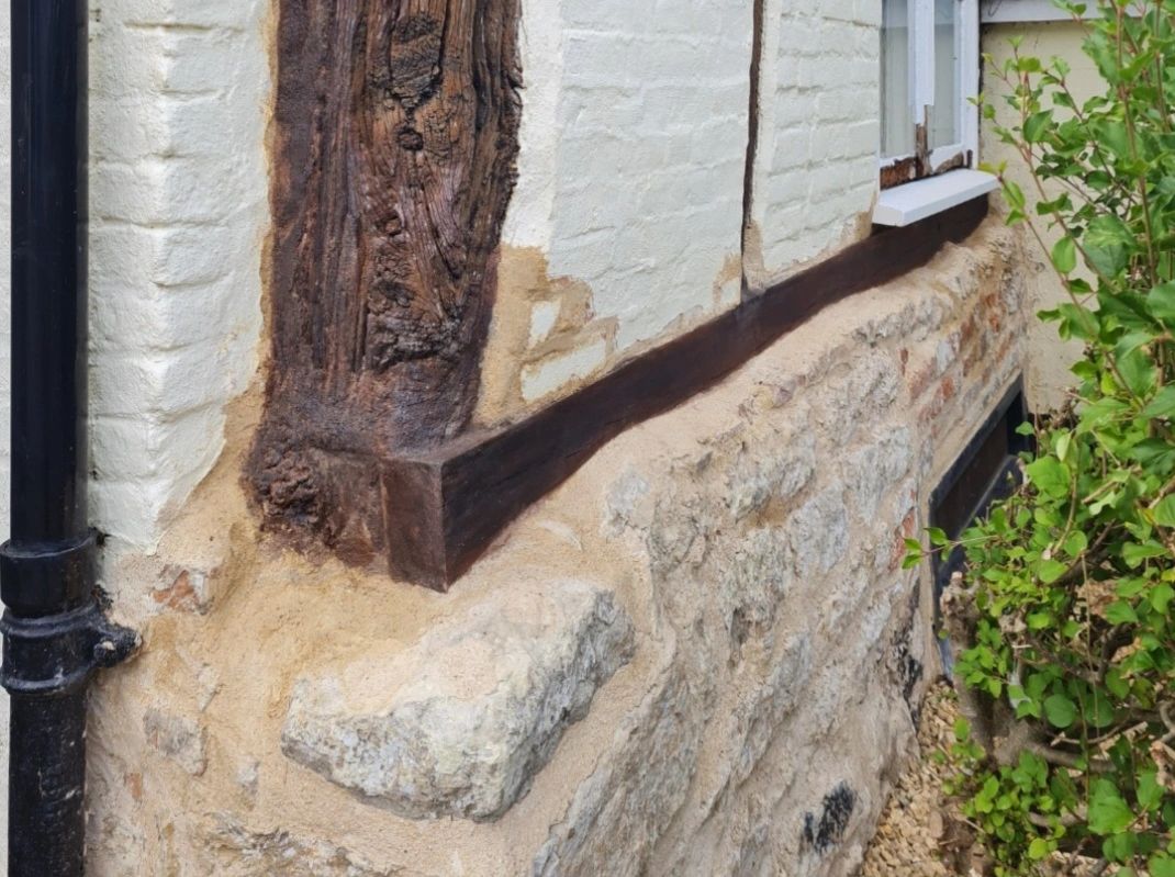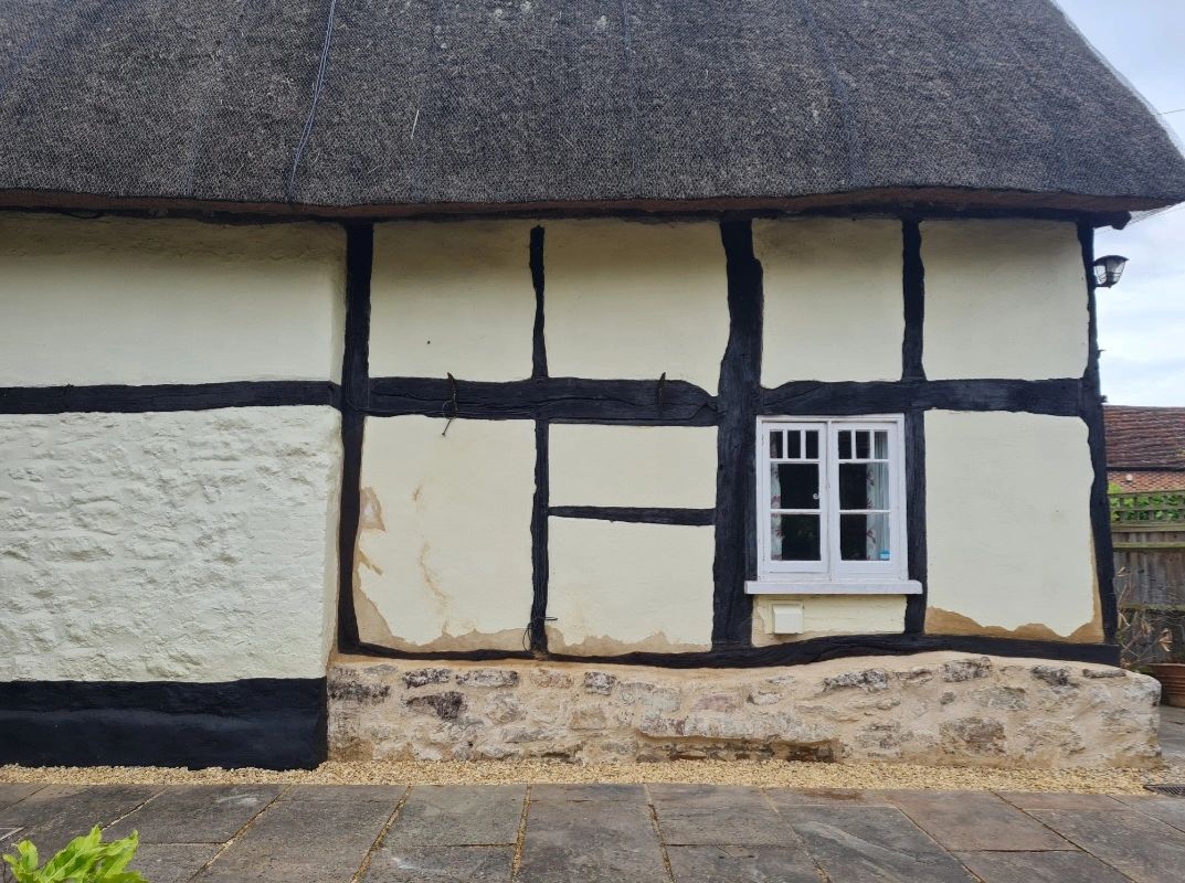 The two main elevations of this 1580's cottage suffered in condition and appearance from a series of unsympathetic cement repairs to the brickwork/pointing and losses to the oak frame over many years