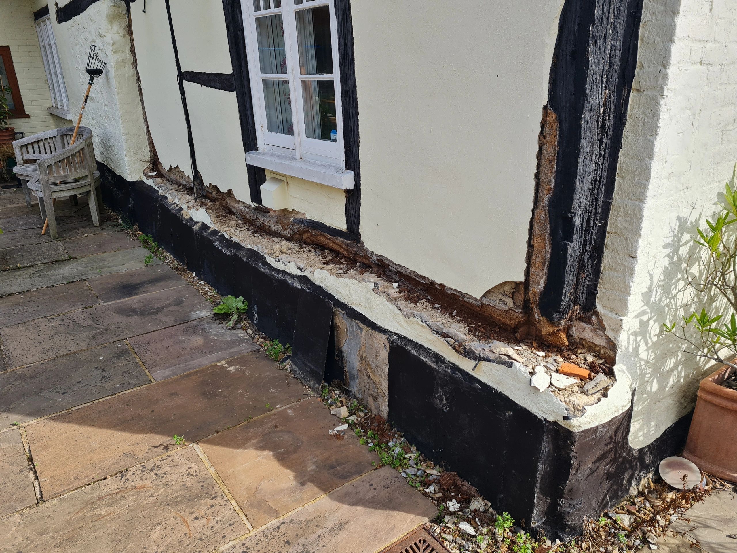 The rear elevation where rising damp had become trapped by new paving, an inadequate French drain, slate upstand and cement repairs/fills - much of the oak soleplate had rotted