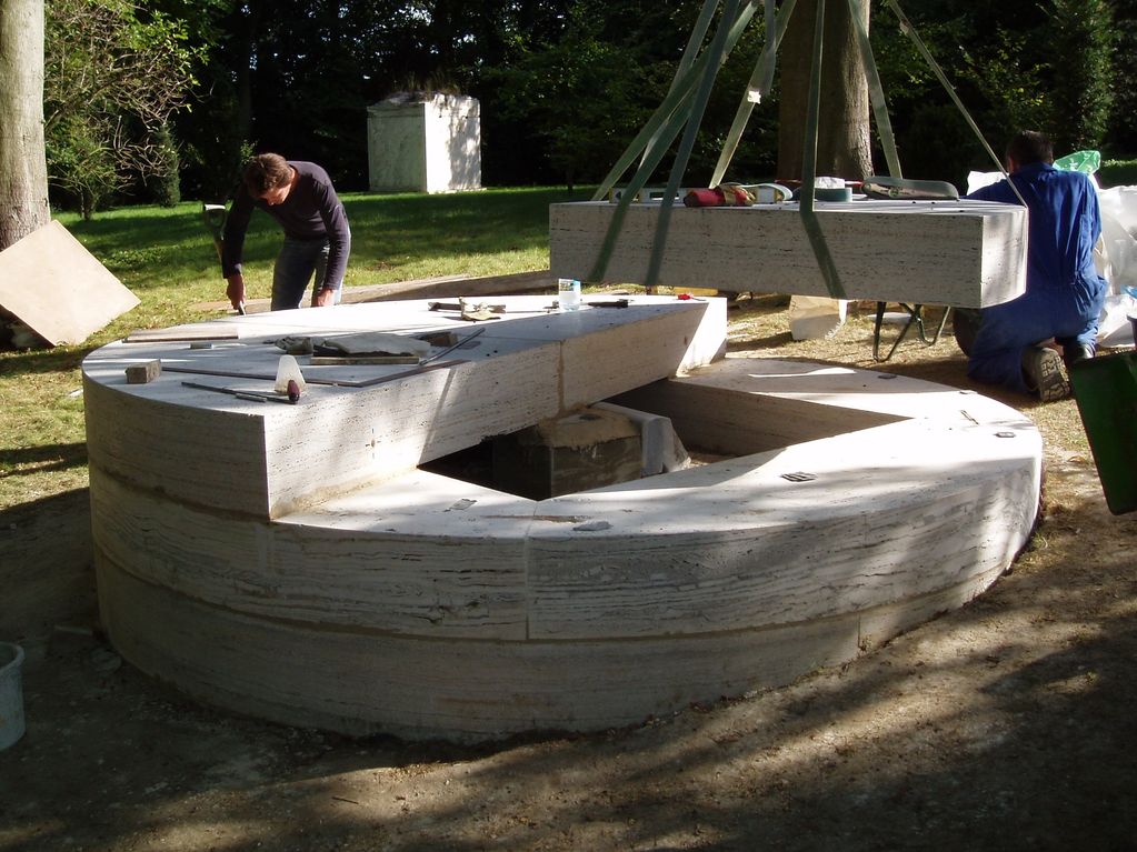 Installation of several large travertine stone sculptures and features by contemporary artist Stephen Cox at Waddesden Manor; as well as numerous other sculptures in the grounds, including the large marble Hercules and pedestal on the entrance drive (CCW Ltd/NT)
